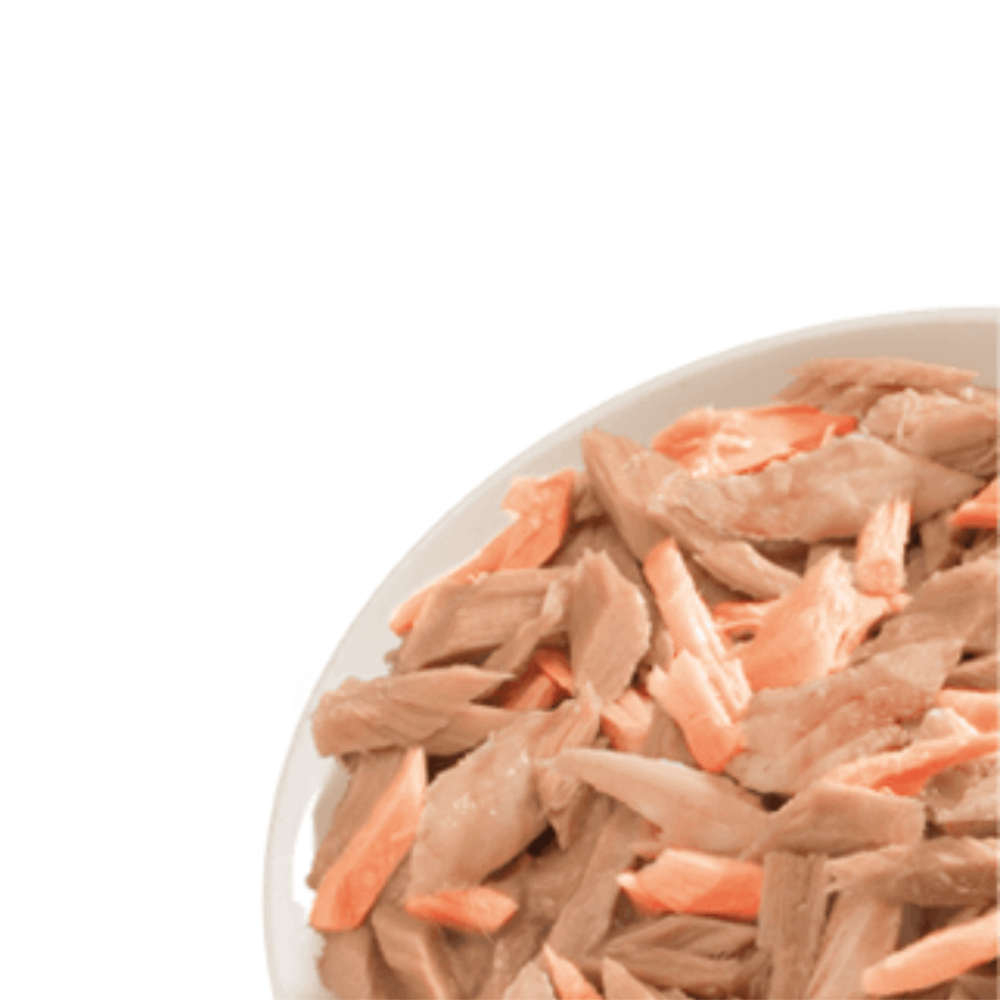 شرائح لحم التونة من الاختيار الأول موجودة بنسبة عالية مع إضافة سمك السلمون. كلها مطهية على البخار ومحفوظة في مرق الطبخ. بدون إضافة أصباغ أو مواد حافظة أو إضافات. إنه طعام غني بالبروتينات النبيلة وأحماض أوميجا 3 الدهنية الثمينة وقليل الكربوهيدرات.